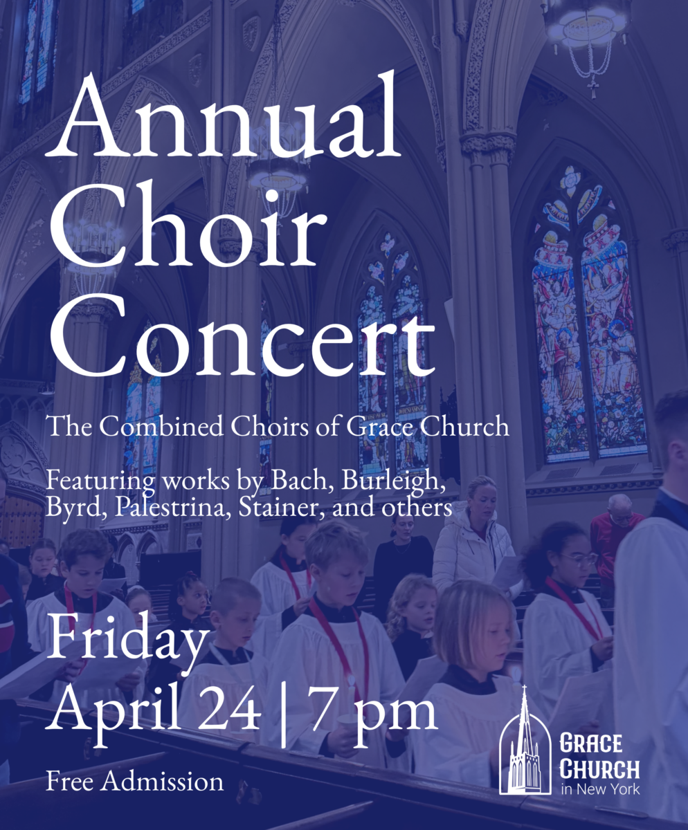 Join us for the Annual Choir Concert featuring The Combined Choirs of Grace Church. The Choirs will offer works by Bach, Burleigh, Byrd, Palestrina, Stainer, and others. A festive reception on Huntington Close will follow the concert. Free admission.