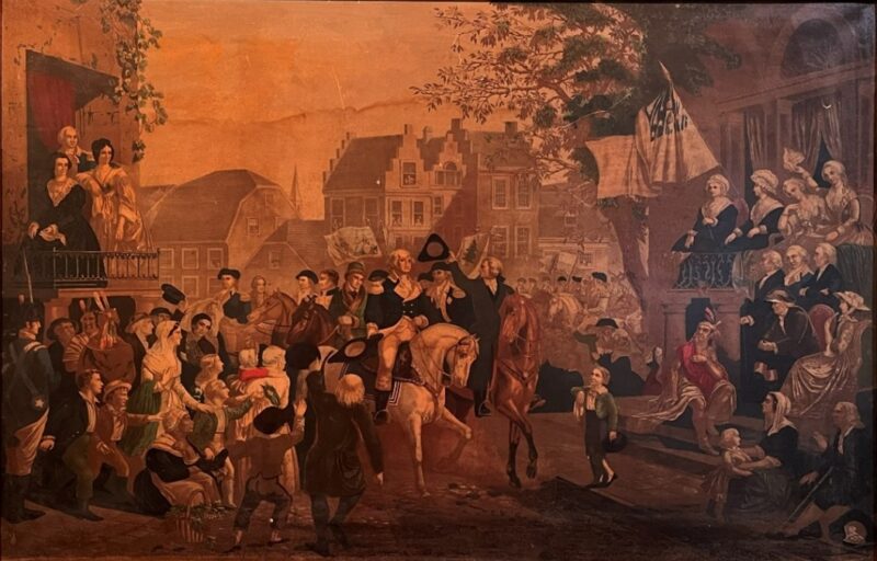 On Palm Sunday, we celebrate the triumphal entry of Jesus into Jerusalem. In pondering the meaning and mystery of today, I recalled a particular scene from the American Revolution was never far from my eyes as a child. You see, my parents owned a large painting that hung in our dining room. Actually, it’s not a painting, but a chromolithograph that illustrates George Washington’s triumphal entry into New York City. These days the painting belongs to my brother and hangs in his house. Last week I asked him to take a photo of it and send it to me, so that I could drop it into our Palm Sunday bulletins for all to see.